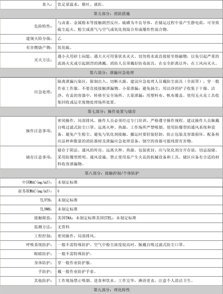 物化性質(zhì):性狀 粉狀硫黃為淡黃色粉末。熔點112.8℃沸點444.6℃相對密度2.07溶解性 易溶于二硫化碳,不溶于水,略溶于乙醇和醚類。
